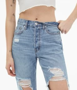 Ripped-up jeans that look straight outta the ’90s. Fabric features recycled cotton, which is crafted from a mix of pre- and post-consumer waste to help reduce landfills.