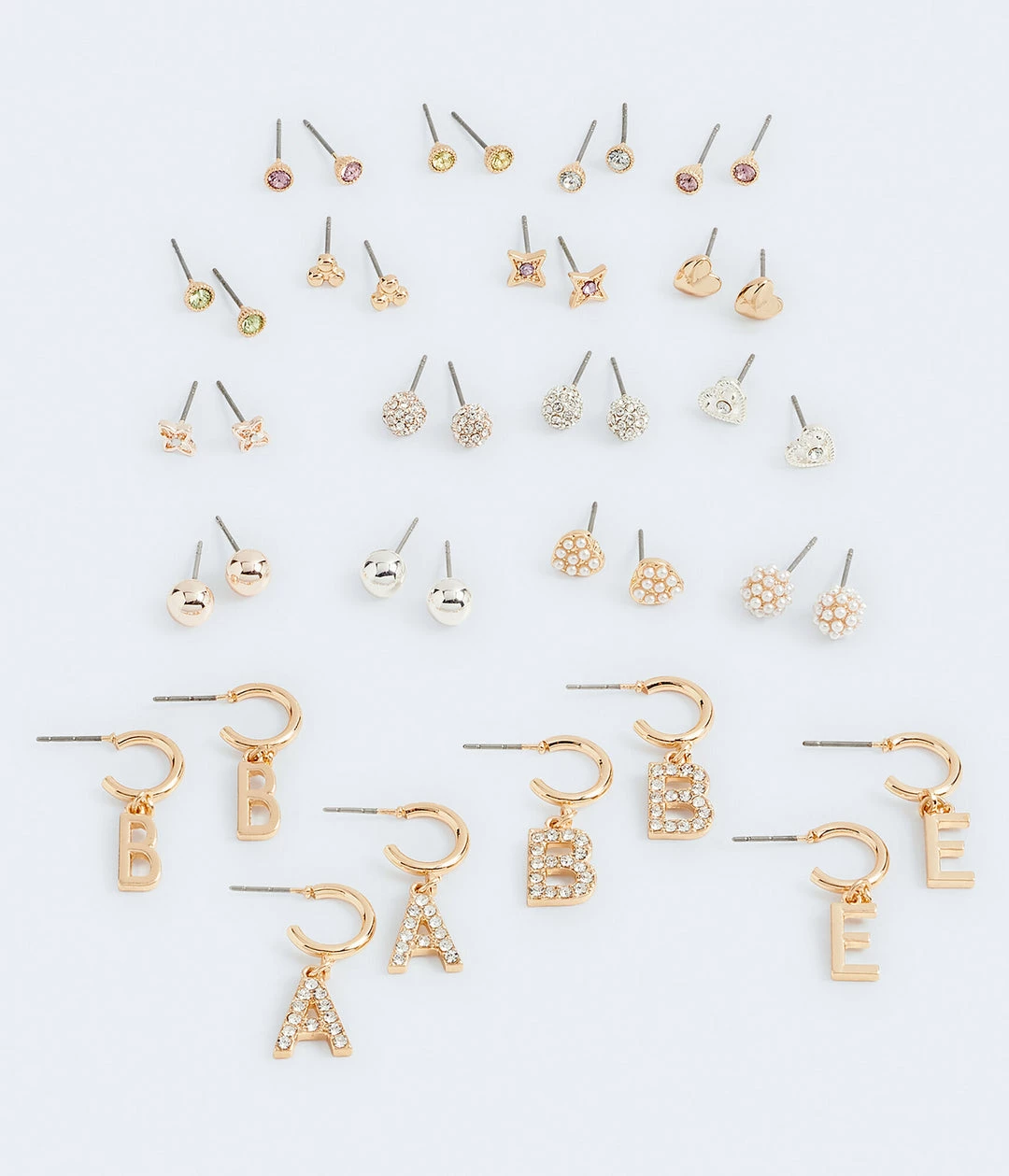 From faux pearls to sparkly rhinestones to letter charms, this on-trend earring set has something for every mood and look.