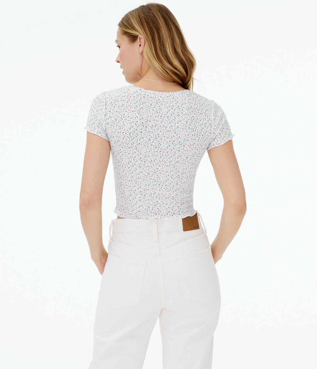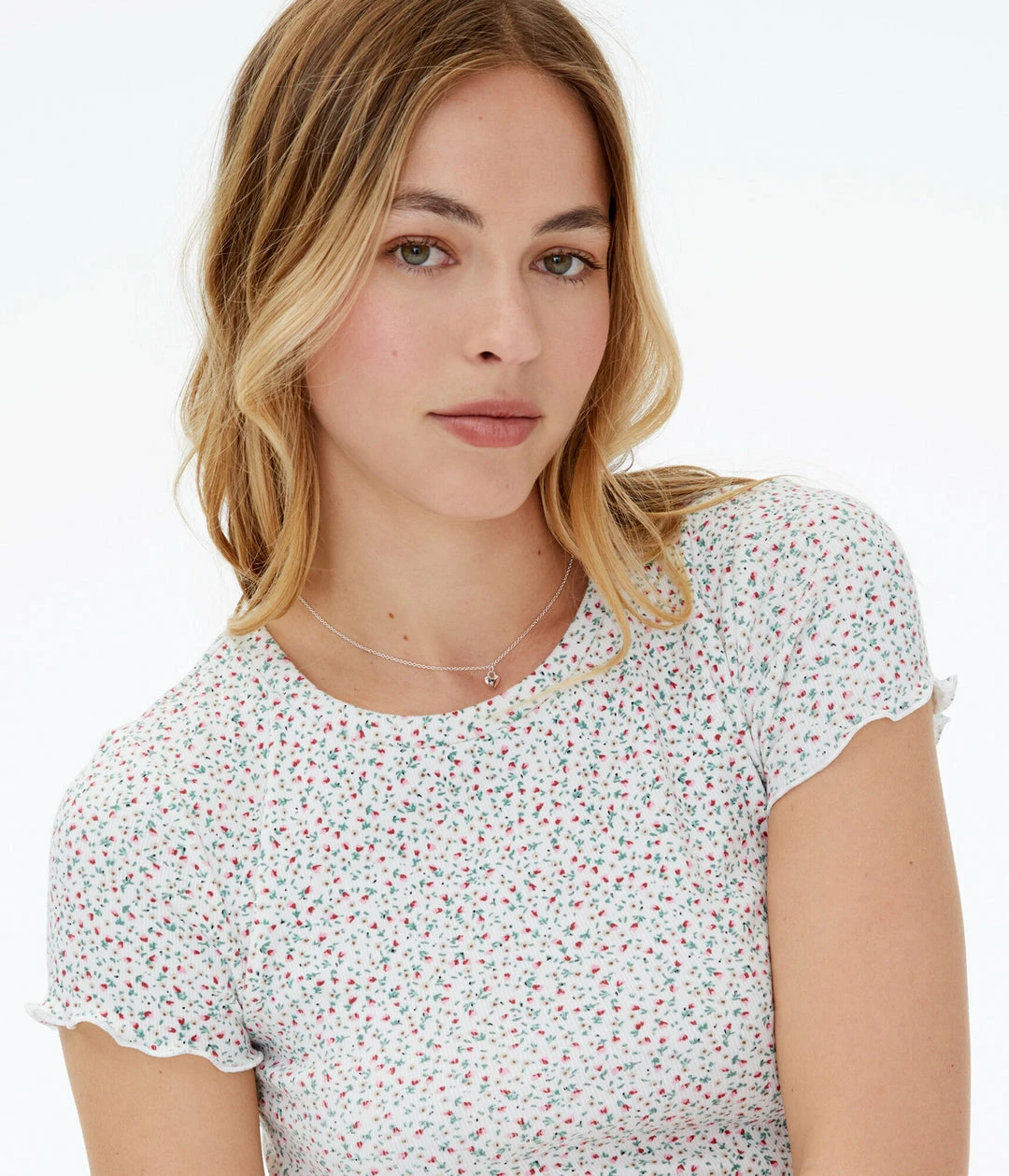 A so-cute cropped tee perfected with a pretty print and feminine lettuce trim.