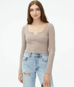Aeropostale Women’s Long Sleeve Notch-Neck Cropped Shrunken Tee