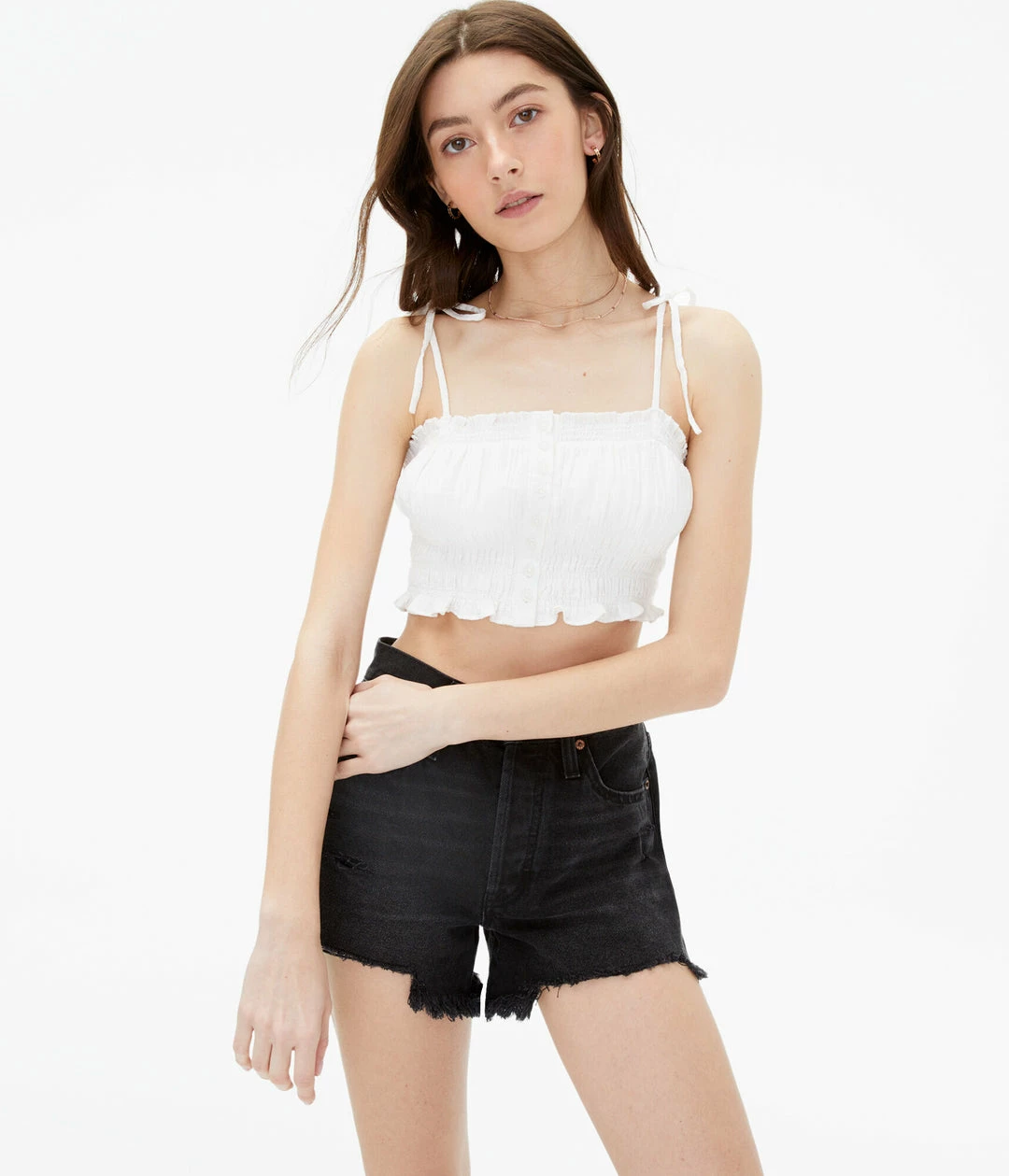 Stretchy smocking and straps that tie ensure this cute crop top feels comfy and fits perfectly. Wear it with your favorite Aero jean shorts.